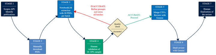 Conducting systematic literature reviews is traditionally a laborious, manual process involving the extraction of distinct data points from hundreds of academic papers, but this presentation introduces a structured, multi-tool workflow using the Scopus API, NotebookLM and Gemini to automate and enhance this task. By employing a pipeline that includes batch processing PDFs in NotebookLM to prevent data omissions and using Gemini for high-level synthesis, the workflow saves an estimated 30+ hours of manual extraction per review and allows sole researchers to tackle large-scale projects previously requiring teams. Validated by emerging research and peer comparison, this approach democratises access to large-scale reviews, though it necessitates a shift in researcher responsibility toward rigorous prompt engineering and ‘human-in-the-loop’ validation to ensure accuracy and avoid model drift.